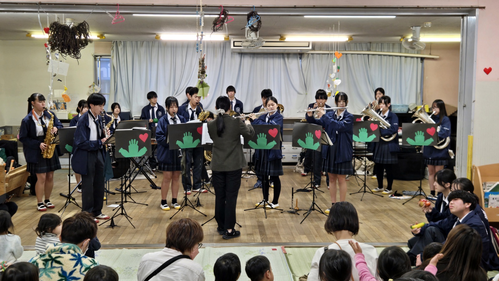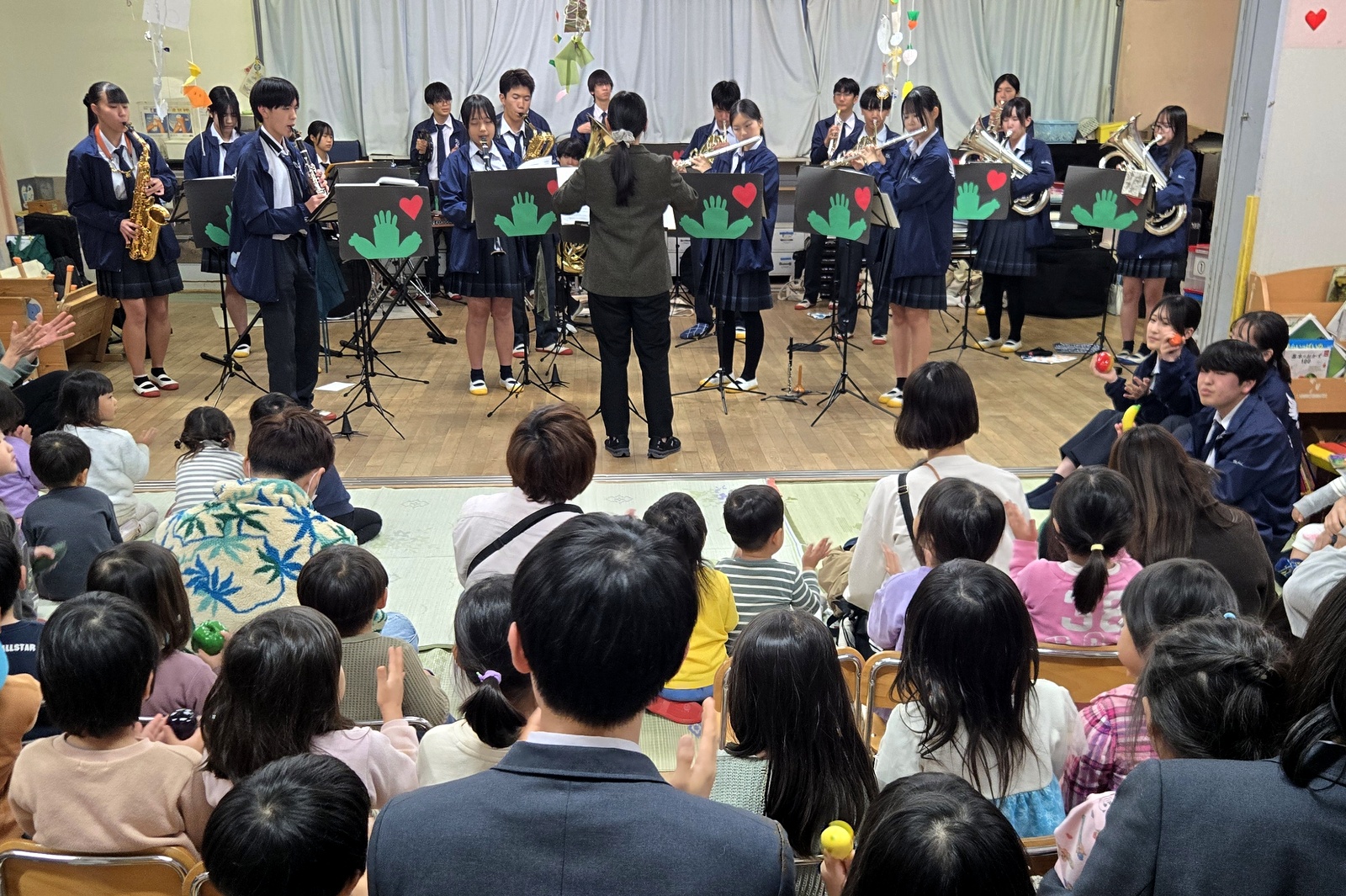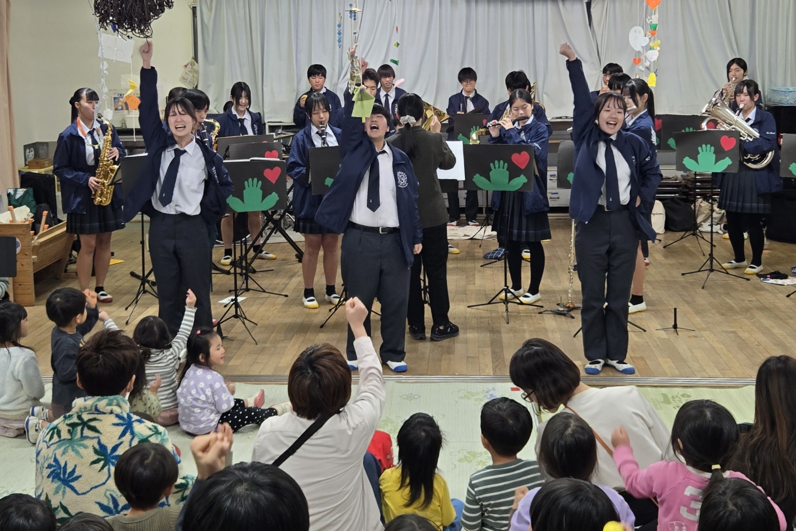 吹奏楽部は演奏するだけでなく、音楽への興味を深めてもらうため、楽器の紹介やダンス、マラカスなどで一緒に体験をしてもらいます。